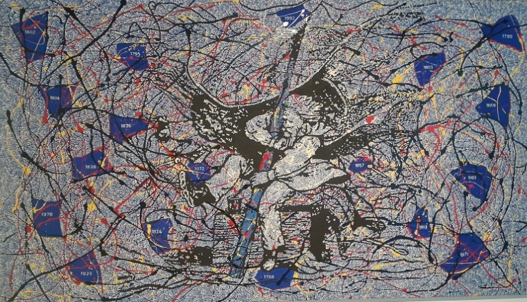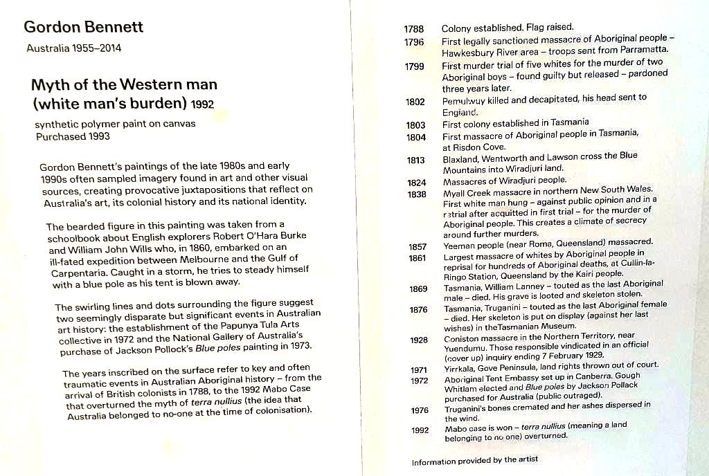 The Gallery once there, kindly supplied me with a wheel chair so as Maria could more readily appreciate the Galleries exhibition. I did not find the layout of the Gallery all that intuitive and rather poorly sign posted. In addition the individual painting descriptions were displayed in a rather smallish font and at inconvenient height . It was nevertheless good to see some famous Dobell, Preston, Drysdale, Boyd, Olley, Olsen, Whiteley and Smart pieces....as well as this from the Qld Aboriginal artist Gordon Bennett exhibited below.