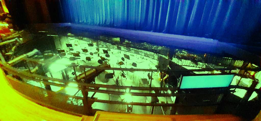 The massive concrete building is beautifully lined with honey coloured wooden panels which gives an unexpected softness to the interior. This is only enhanced as one enters the theatre itself which is filled with bright 'tomato' coloured upholstered seats and a massive royal blue curtain. The orchestra pit would hold probably about 30-50 members. While our opera was sung in the original Italian, a translation in English of the libretto is displayed in large LED screens above the stage, this is now common practice in many other opera houses around the world. In addition, there were a number of monitors mounted around the mezzanine floor which display the conductor's movements to the singers on the stage in front of him.