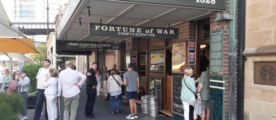 We decided to take a peek at the finale of St Patrick's Day down at The Rocks where things were a little more subdued than they had the day before. We settled down for a light lunch of fish (flathead) & chips at the historic Fortune of War Hotel. Feeling a little weary we went home and bought some take away dumplings from a local Japanese restaurant.