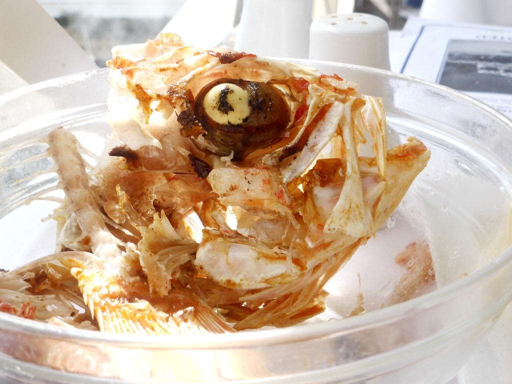 This fish was eventually served under a pile of Thai salad. However, it was clear from its exterior appearance that the fish had not in fact been carefully baked in an oven wrapped in either baking paper, foil or banana leaf but rather deep fried in a wok or similar. The desiccated skin of the fish simply snapped when touched and the resultant flesh was so dry it could not be readily prized from the skeleton frame.