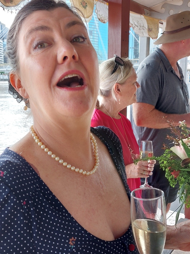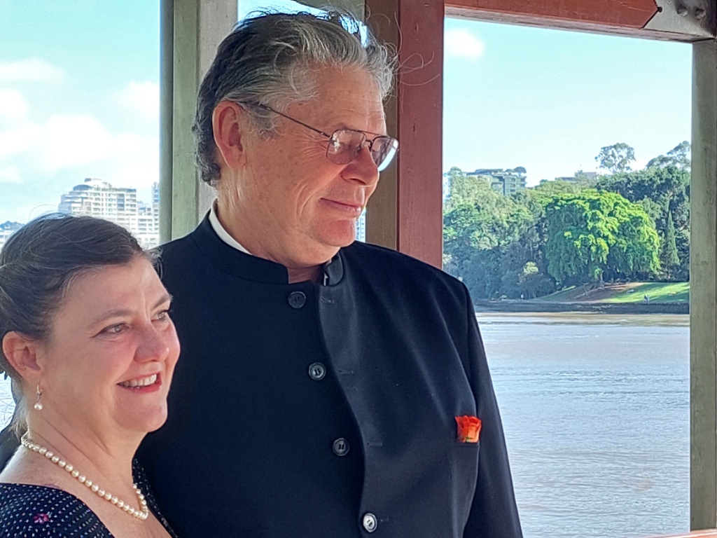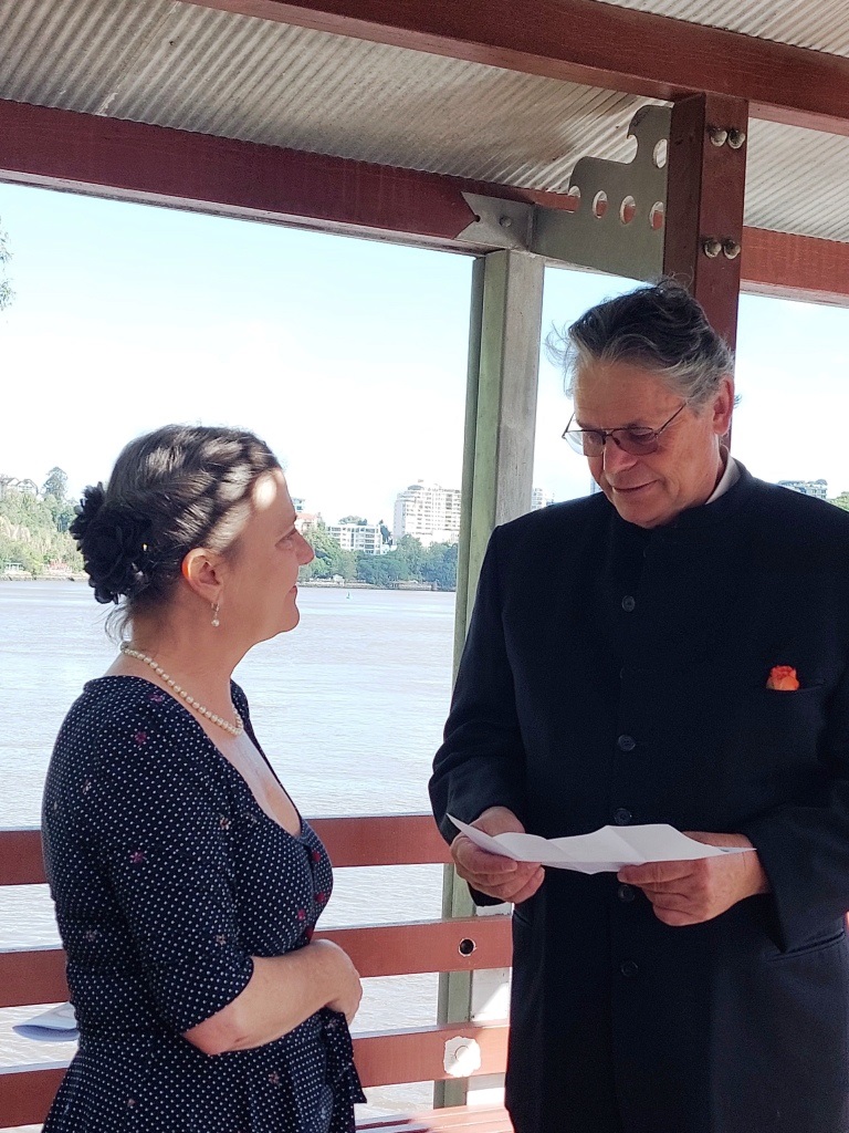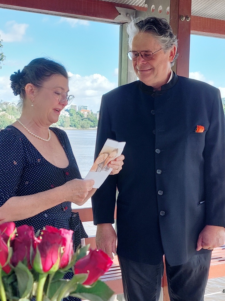 Coincidently with this planning, was the idea that perhaps the time was also propitious for taking the plunge into marriage......I mean the 10 year courtship was looking a little bit edgy . When eventually consulted, we applauded the idea but had no idea that it (the wedding) was to take place so quickly in a no frills ceremony in one of the many small wooden pavilions on the banks of the the Brisbane River at Kangaroo Point. In keeping with this pared-back logistical event, was the decision to keep it a secret. So, there no 'Bands' read in the local church, no gilt edged invitations procured let alone sent out, no time to fit in either a 'Hens" or 'Bucks" night out and no special hats, gowns or even confetti was purchased. The event was in stark contrast to Ben and Sarah's wedding held years earlier on a party yacht during a sunset cruise around Darwin harbour.