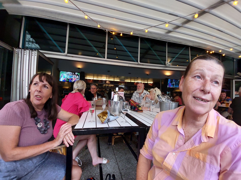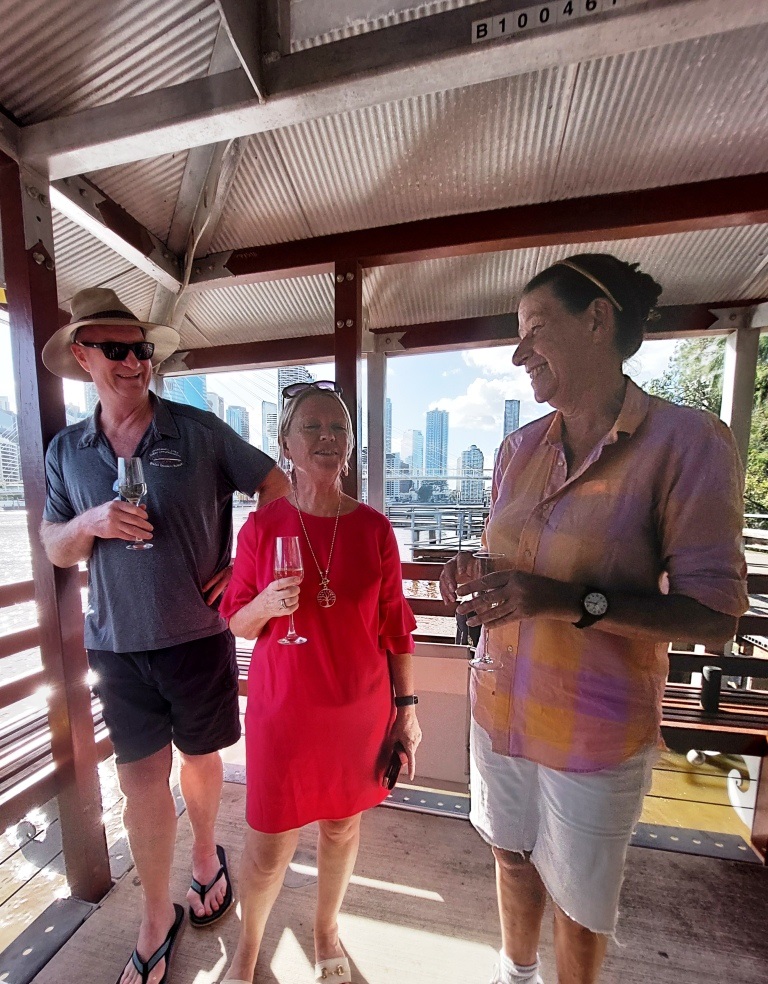A day prior to the event, we booked Greca (a Greek restaurant down on the river at the renovated Howard Smith Wharf) for a surprise family lunch. Surprise it was, with Amy almost reduced to tears at seeing Ben and Sarah turn up suddenly at the restaurant bar. Earlier, we had ferried across the river and Brisbane reminded us all of its propensity for anti-social tropical weather events and let drop about 50mls of rain .....it bucketed down.....making trips to the toilet sans umbrellas a bit of a challenge! The food and service at Greca was great.